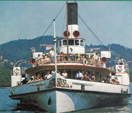 Sascha schaute freudig rum. Leider vergass ich auch einmal nach hinten zu gucken. Dann, plötzlich ein tiefes HUUUP HUUUP (hörte sich fast an wie im Film 'Titanic'), ziemlich erschrocken drehte ich mich um. Oh je, hinter uns nahte, ich hatte das Gefühl verdammt schnell, ein grosses Kursschiff. Ich gab Vollgas, begann zu schwitzen, denn der Gasknüppel war durchgedrückt, doch ich hatte das Gefühl wir würden stehen bleiben. Unsere Nussschale wollte sich irgendwie nicht vom Fleck bewegen. Das Schiff nahte bedrohlich. Langsam bewegten wir uns aus der Schusslinie. Da wir aber noch sehr nah am grossen Dampfer waren, als dieser uns kreuzte, hatten wir ziemlich starken Wellengang. Puh, dies war ja nochmals gut gegangen. Mir war nun die Lust vergangen. Ich schaute auf die Uhr. Zu meinem Glück war die Stunde bald vorbei. Wir steuerten wieder den Steg an. Wir stiegen aus, und ich hatte immer noch ziemlich weiche Knie. So wie es aussah bekam auch Sascha die Aufregung nicht so gut, denn er riss mich genau vor die Eingangspassage für das Kursschiff und dann passierte es. Durchfall, er machte sein Geschäft genau dahin wo in ein paar Minuten die ersten Fahrgäste durch gehen sollten. Der Mann von der Bootsvermietung nahm es gelassen. Er holte einen Eimer mit Wasser und begann das Unglück wegzuspülen. In dem Moment schaute der Kapitän des Schiffes runter und schrie los:. "Wohl von allen guten Geistern verlassen! Alles nass zu spritzen und dadurch den Steg in eine Rutschbahn zu verwandeln. Hör sofort damit auf!" Er sah ja nicht mehr was kurz vorher passiert war. "Es reicht nun! Meine Fahrgäste wollen mit trockenen Schuhen ankommen!" Der arme Bootsverleiher, da wollte er mir helfen und nun dieser Anpfiff des Kapitäns und dies vor all den Leuten.